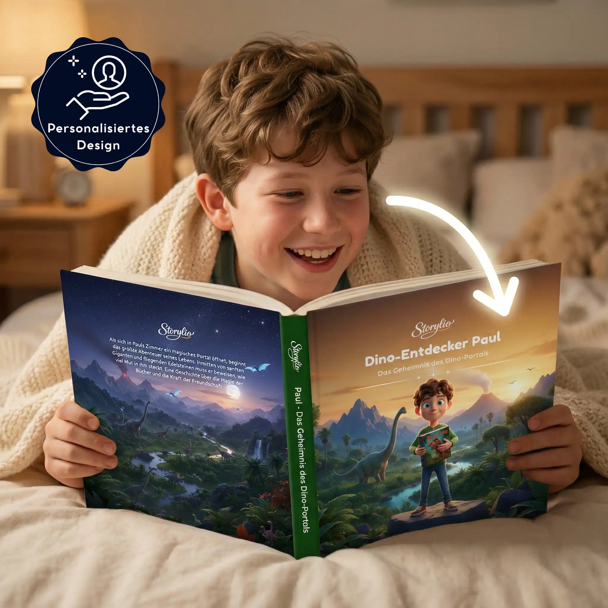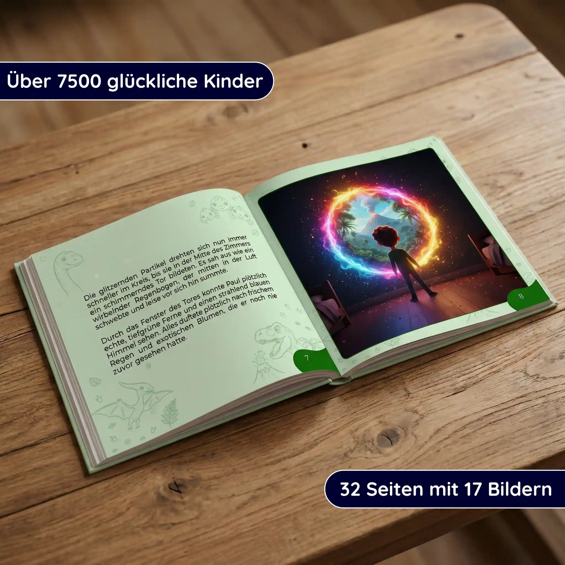 Dein Kind reist durch ein magisches Dino-Portal und entdeckt eine Welt voller Abenteuer 🦖. Eine Geschichte über Mut, Neugier und echte Freundschaft in einer längst vergangenen Zeit ✨.